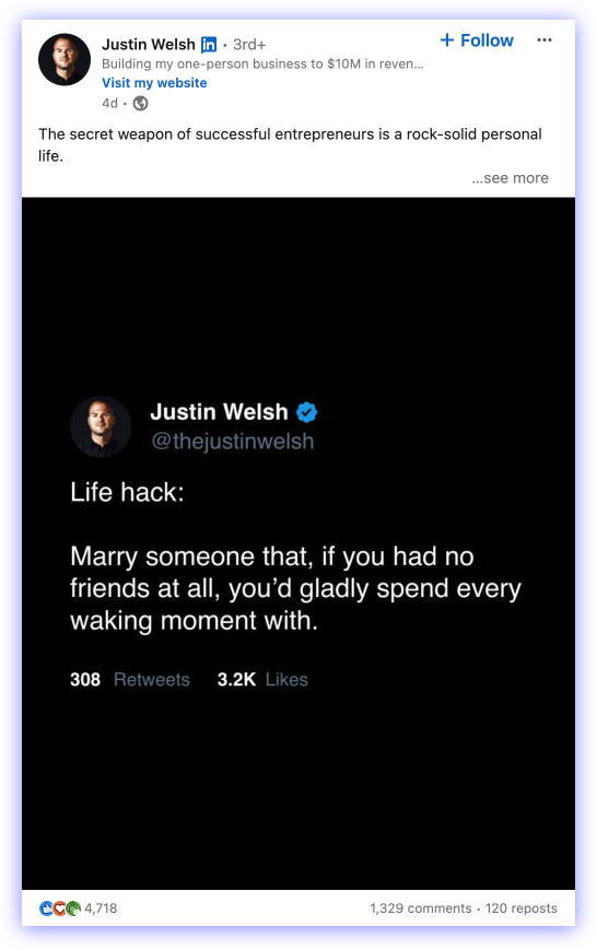 Another viral post this week, it got 14,758 likes in 3 days and performed 4-10 times better than Justin's other posts.