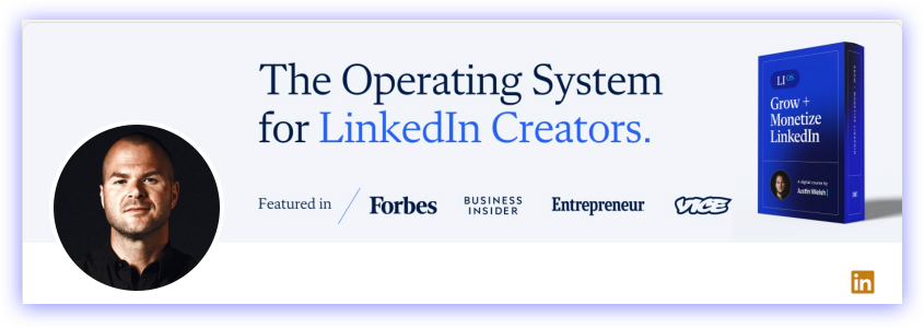 Justin’s profile presents his main product, explaining what he does: “The Operating System for LinkedIn Creators.”