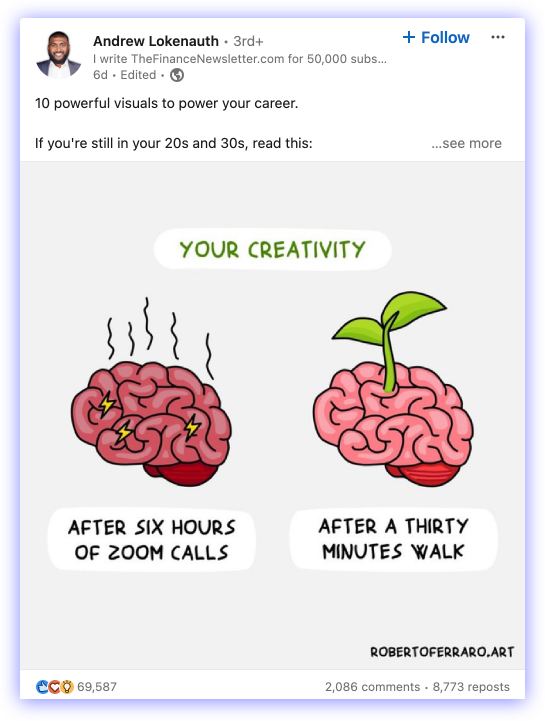 Classic but powerful hook. A numbered list is a classic template for grabbing attention. Classic doesn’t mean ineffective. “10 powerful visuals to power your career” piques people's interest."