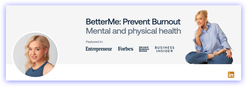 Her banner highlights the main value proposition of BetterMe: “Prevent Burnout: Mental and Physical Health.”