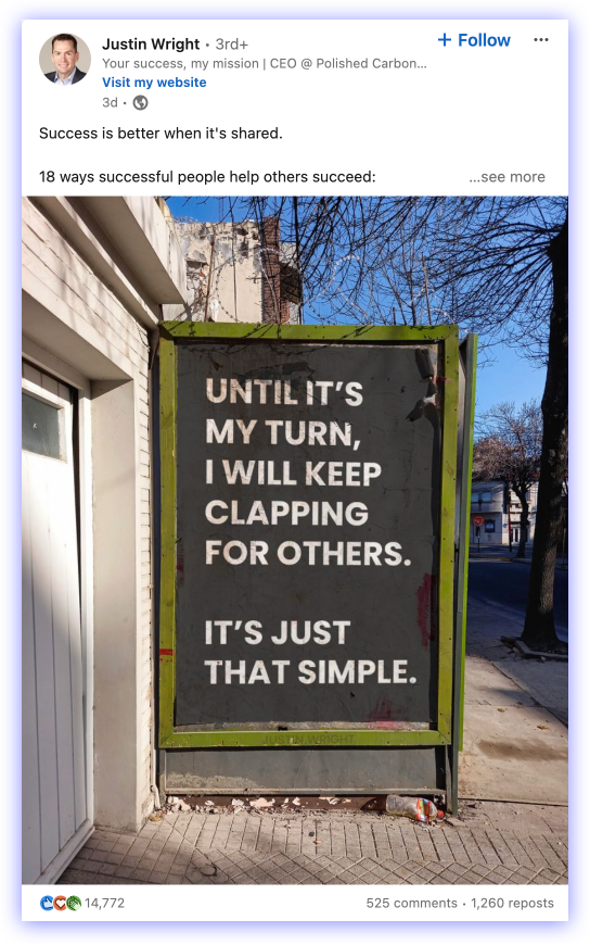 Strong hook: The post starts with the statement, “Success is better when it's shared,” followed by the sub-hook, “18 ways successful people help others succeed.” This draws readers in, making them want to learn more.
