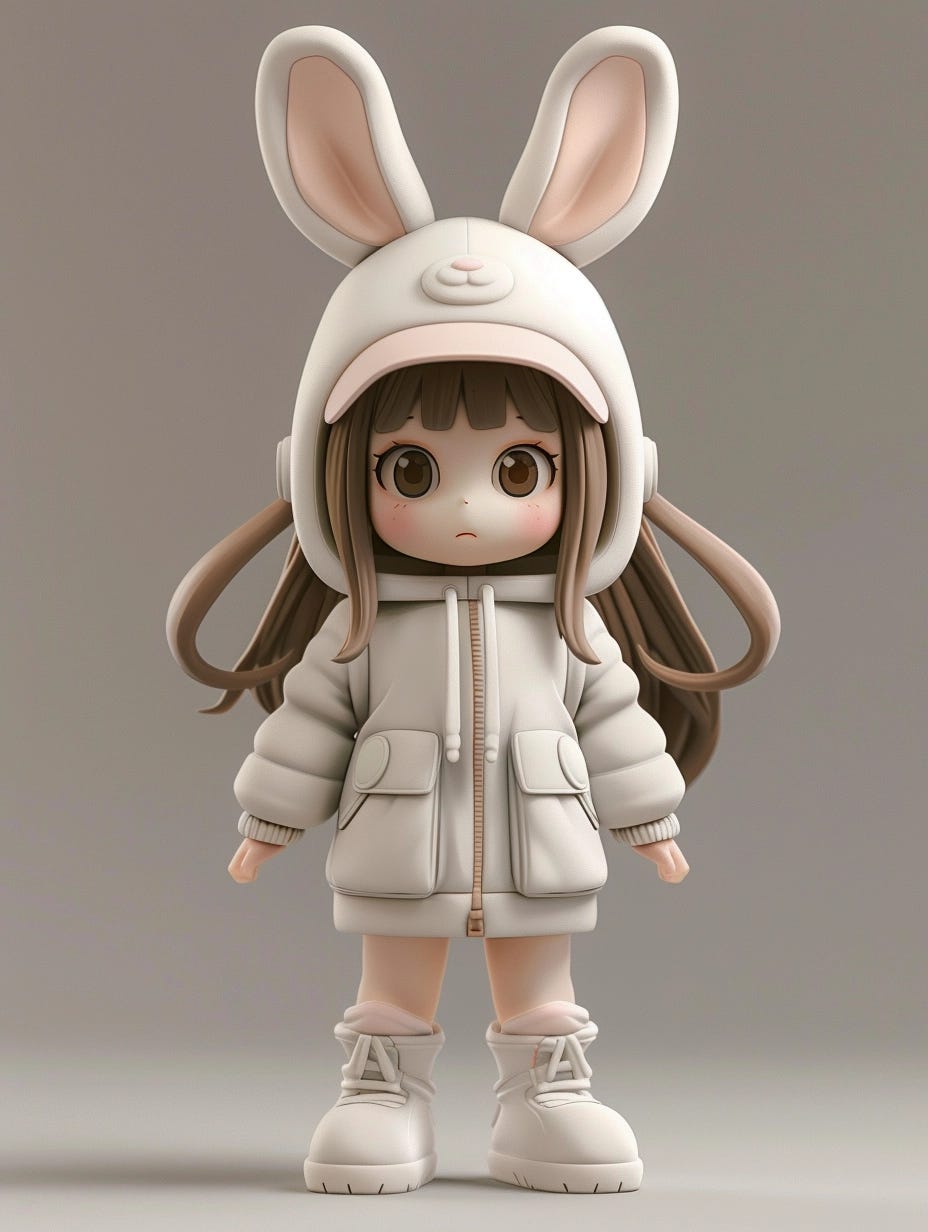 Full body, a cute girl figure blind box collectible from Pop Mart, with rabbit ears hat, overall simple, childish expression, very attractive, chibi style, 8K resolution, super high detail texture and light/dark lighting effects, Cinema 4D, high quality 3D model, straight view