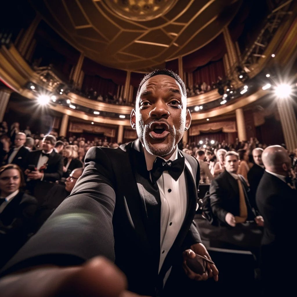 gopro view of Will Smith wearing a tuxdeo slapping the camera forcefully, Oscars award ceremony in the background, fine art cinematic portrait photography, ultra hyper realism, dramatic lighting, action photograph --v 5 --s 750
