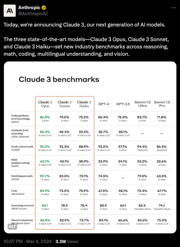 Claude 3 Intro: Anthropic has launched Claude 3, with Claude 3 Opus being the star, claiming to outdo GPT-4 in all major tests.