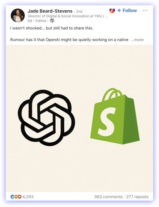 This post went viral, receiving 4.2k likes in 6 days. It received 20-390 more engagement and views than Jade's previous posts.