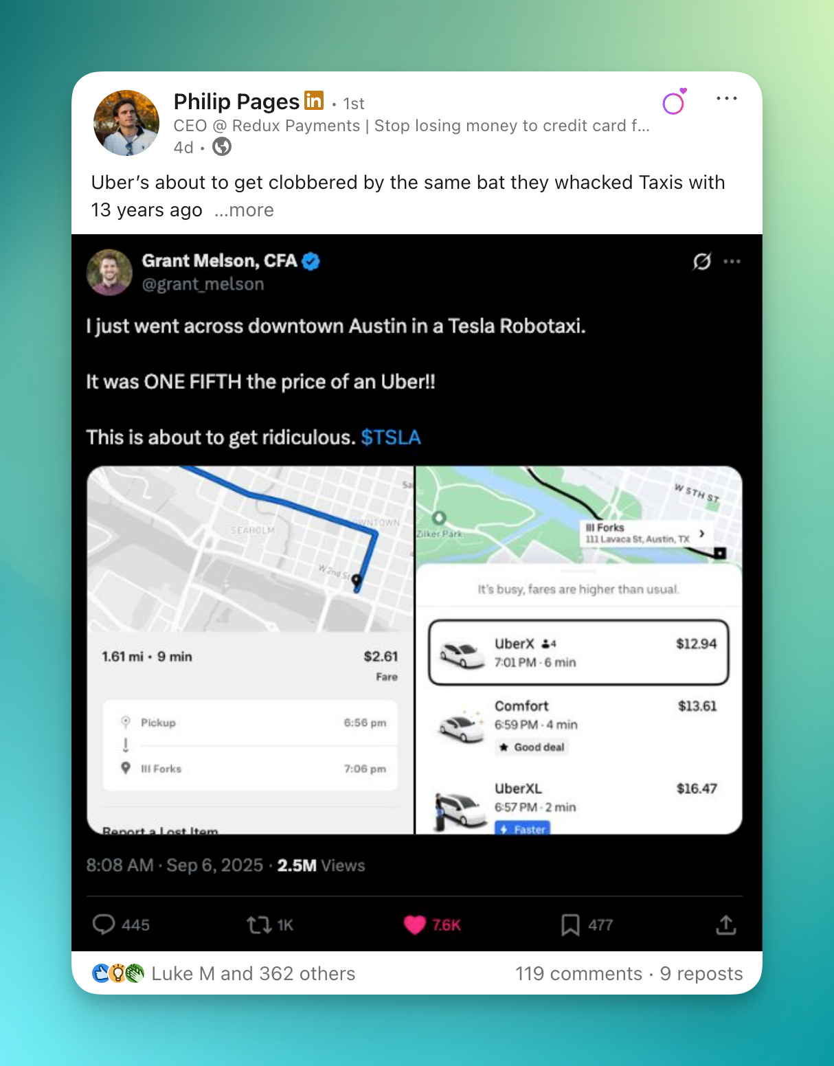 This post captured a major industry disruption happening in real-time with clear visual proof. The irony of Uber getting disrupted the same way they disrupted taxis was too perfect to ignore. The side-by-side price comparison ($2.61 vs $12.94) made the threat undeniable and shareable. Philip showed deep industry knowledge by analyzing Uber’s entire history and competitive position, then laid out multiple strategic scenarios that got industry experts debating in the comments.