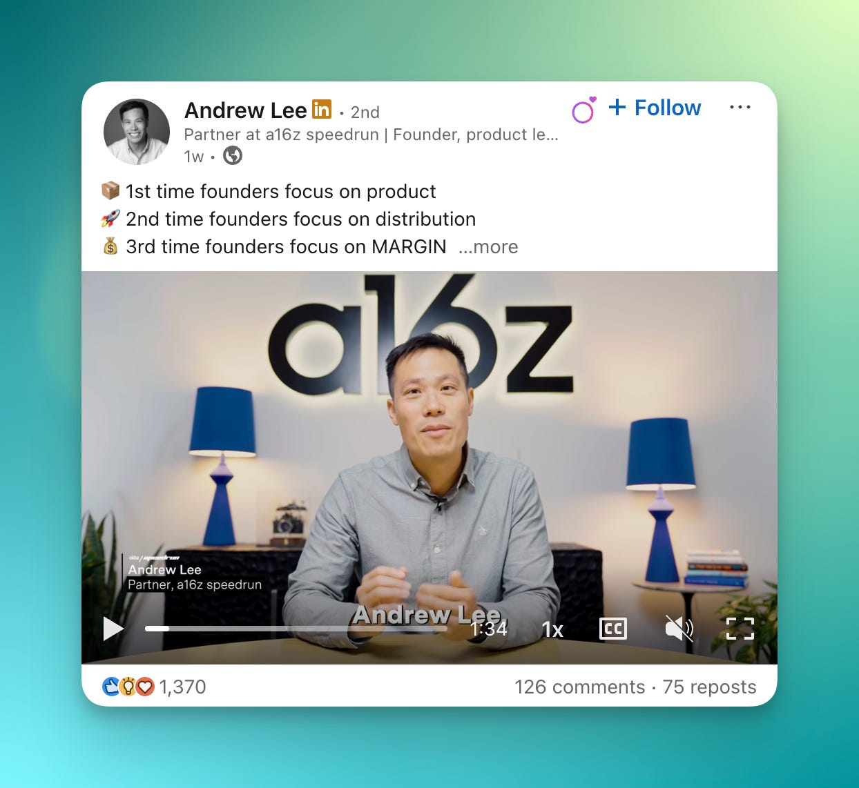 This post went viral, receiving almost 1.3k likes in a week. It received 37-57 more engagement and views than Andrew’s posts this week.