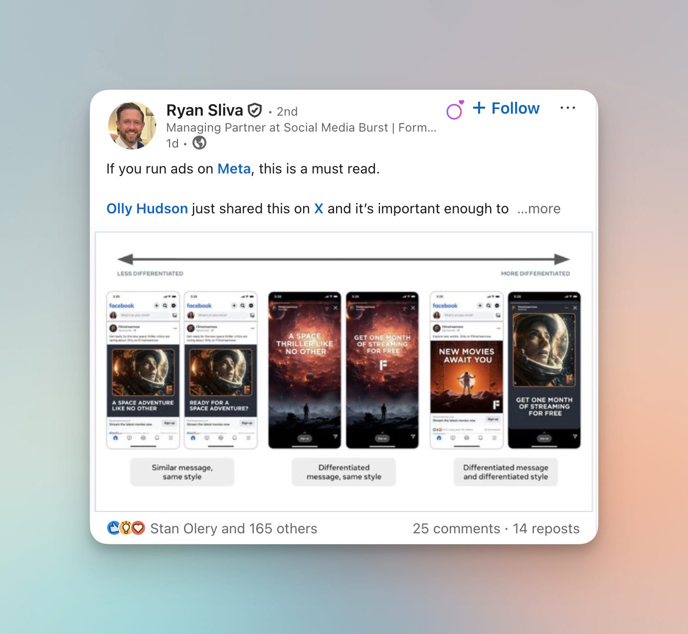 This post revealed a significant platform algorithm change that directly impacts thousands of advertisers’ performance and budgets. The insider information from a Meta workshop made it feel exclusive and authoritative. Most importantly, it explained both the “what” (algorithm change) and the “why” (Meta wants persona-based variation), giving people the strategic understanding to adapt rather than just following blind tactics.