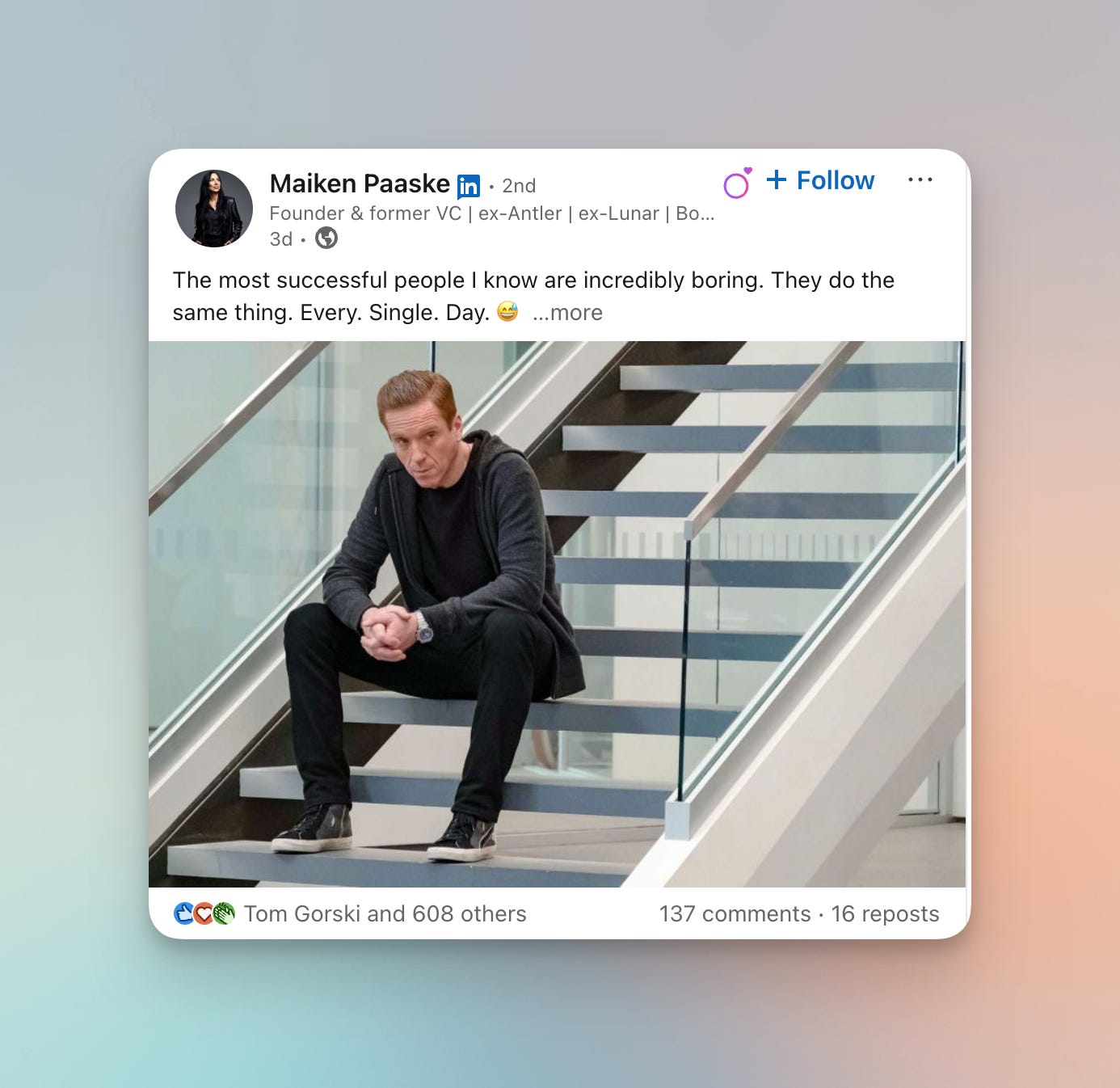 Counterintuitive opening: “The most successful people I know are incredibly boring” - challenges glamorous success narrative