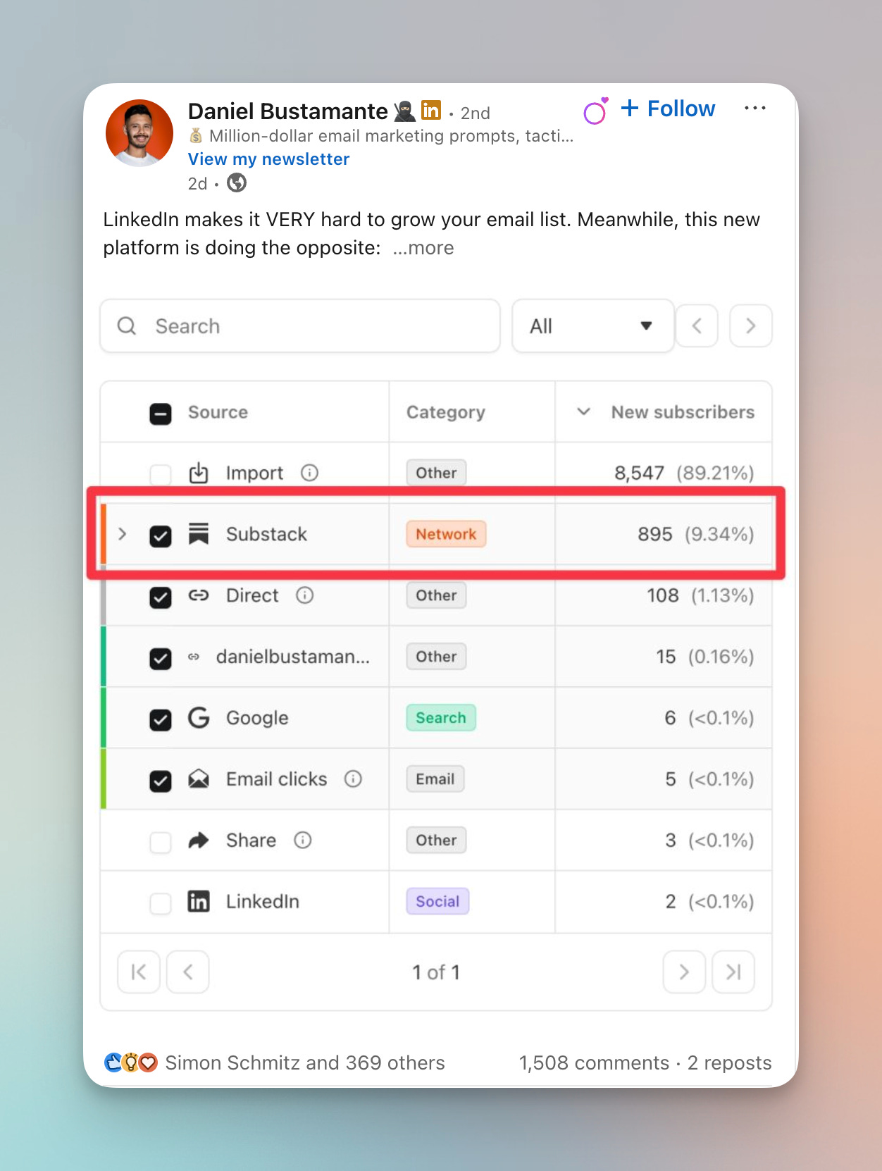 Personal results: “In the past 90 days, I’ve gotten 895 newsletter subscribers from Substack”