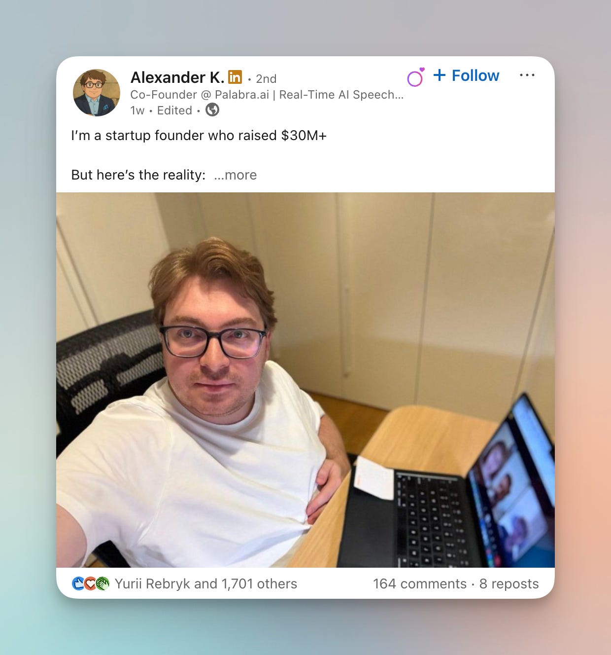 This post destroyed a pervasive myth that raising money equals instant wealth and success. The casual selfie in a t-shirt working from a basic setup was perfect - it didn’t match what people imagine a “$30M raised” founder looks like.