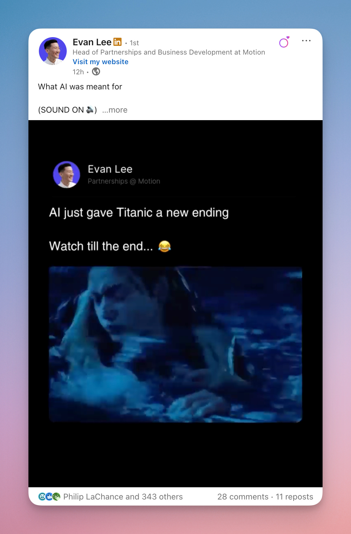 The post combined entertainment (AI giving Titanic a happy ending) with practical business education (5 AI strategy learnings).