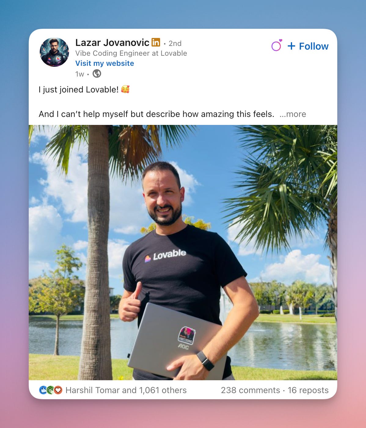 Emotional hook: “I just joined Lovable! 🥰“ - pure excitement.