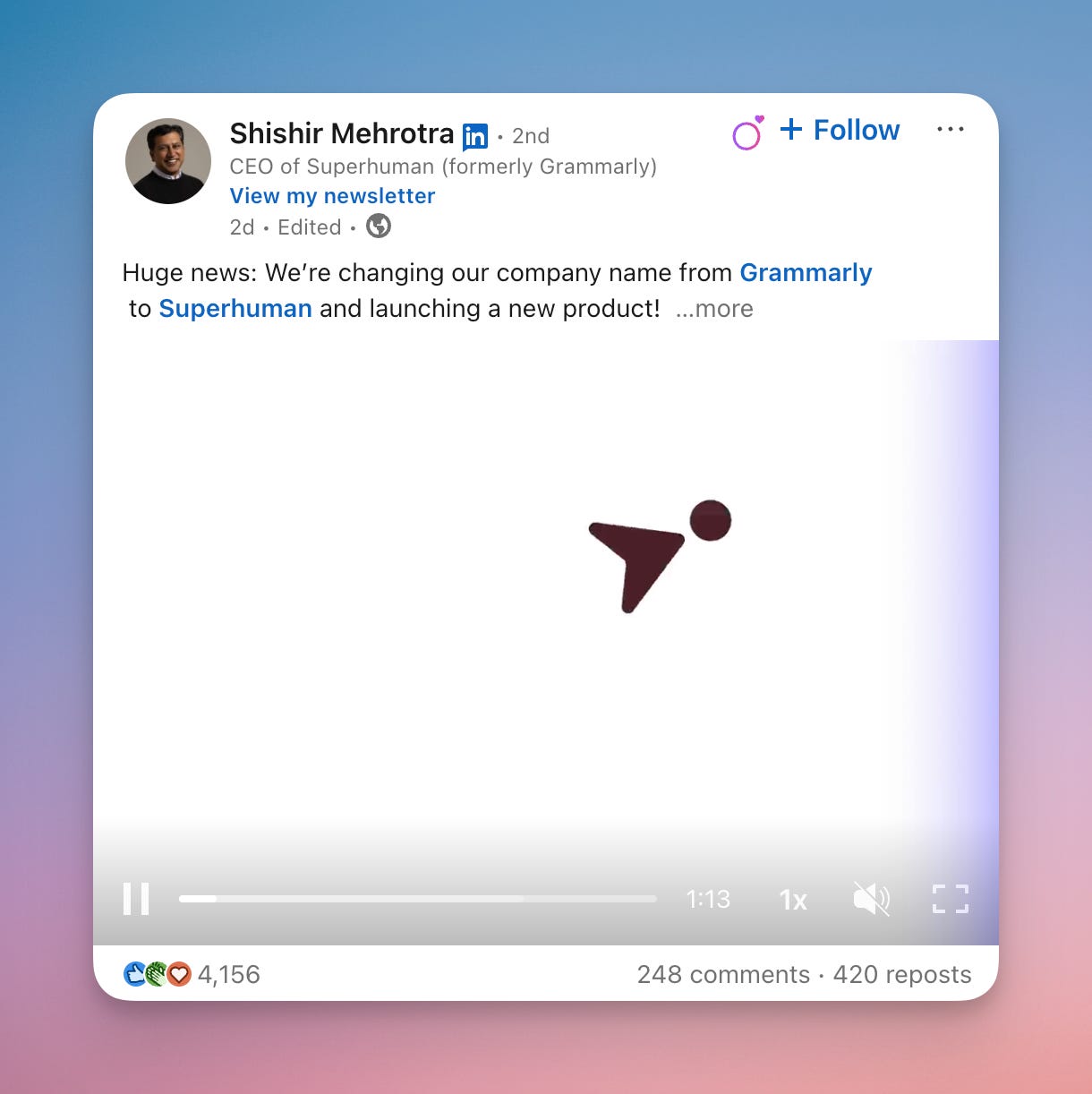Major news announcement: “Huge news: We’re changing our company name from Grammarly to Superhuman” - immediate attention grab