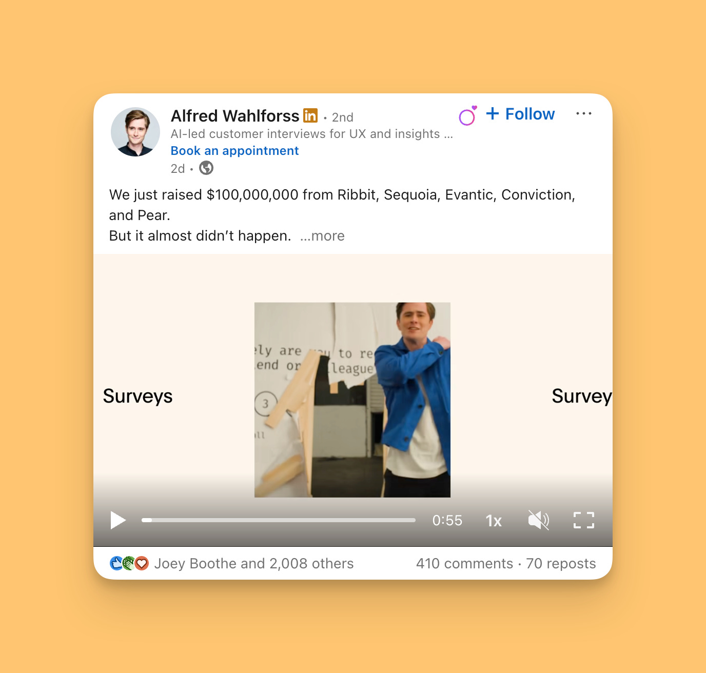 Massive hook: “$100,000,000” with big-name VCs (Sequoia, Ribbit) - stops the scroll instantly