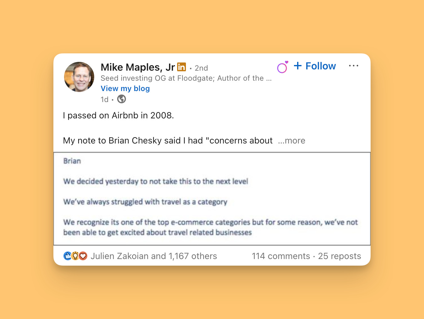Shows the receipts: Includes the actual rejection note to Brian Chesky - proves it’s real, not just a story