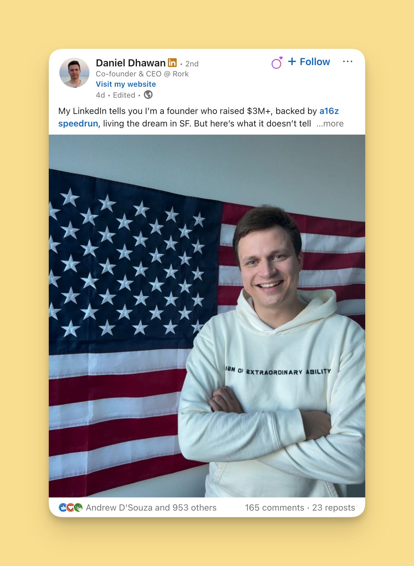 2. My LinkedIn tells you I’m a founder who raised $3M+, backed by a16z speedrun, living the dream in SF.