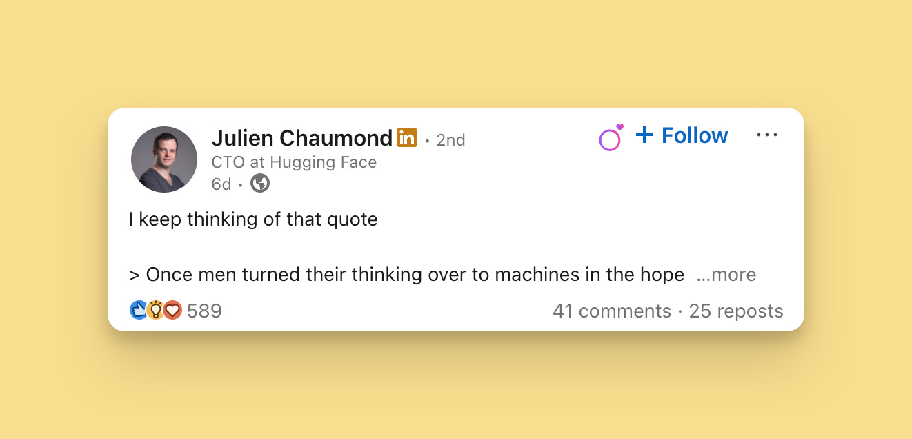 This post works because of who’s saying it and when. The CTO of one of the biggest AI companies sharing a warning about machines and enslavement from a 1965 sci-fi novel feels loaded.