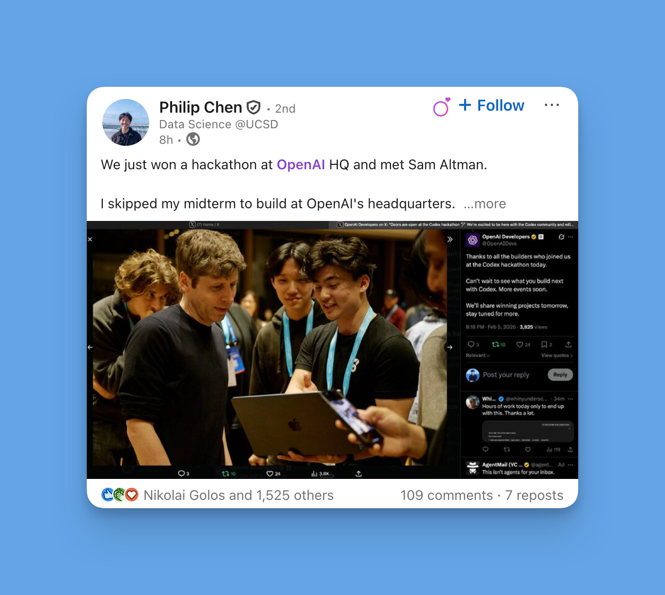 Double hook: “Won a hackathon at OpenAI HQ and met Sam Altman” - two impressive things in one line