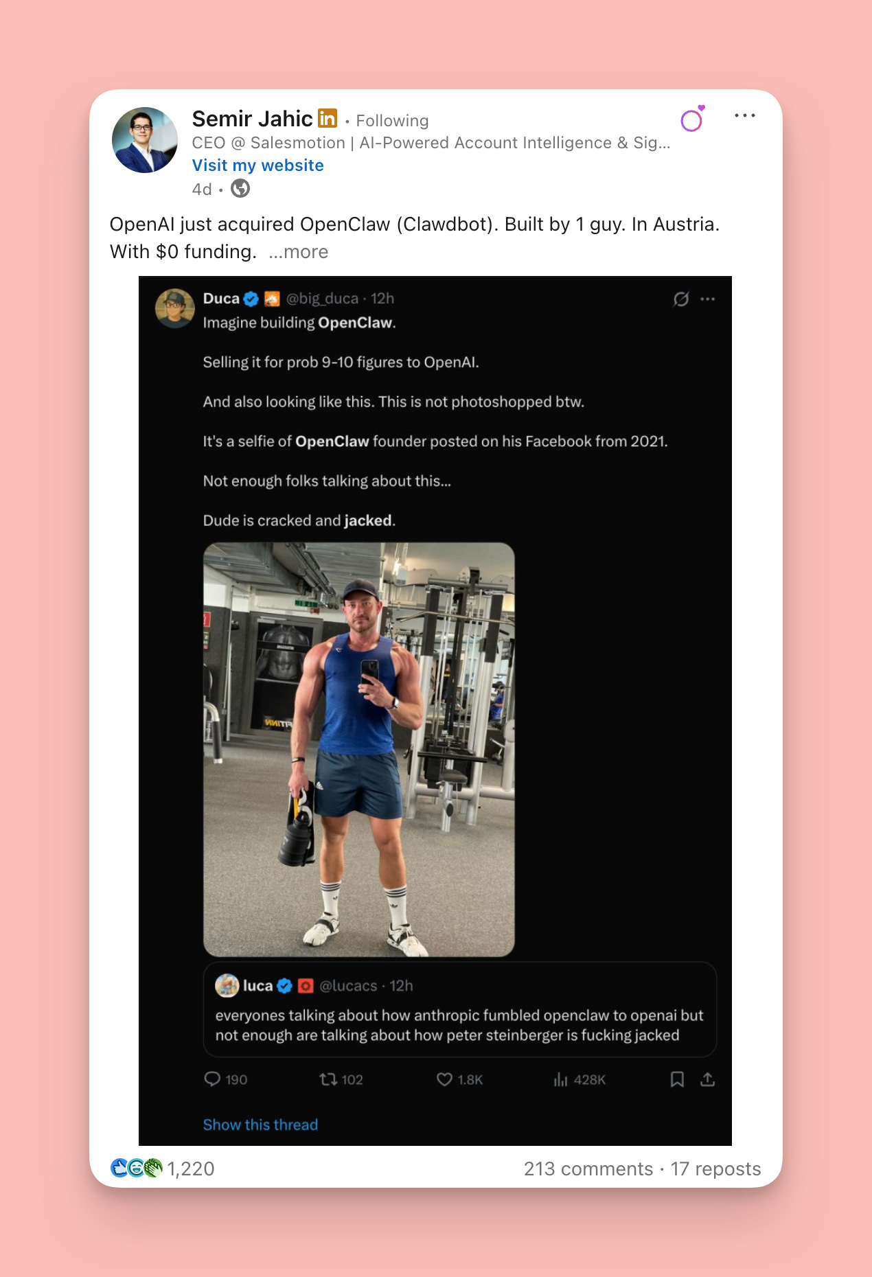 What’s hot this week: conversations around Openclaw’s founder and the move to OpenAI. Anything related is getting strong traction on LinkedIn.