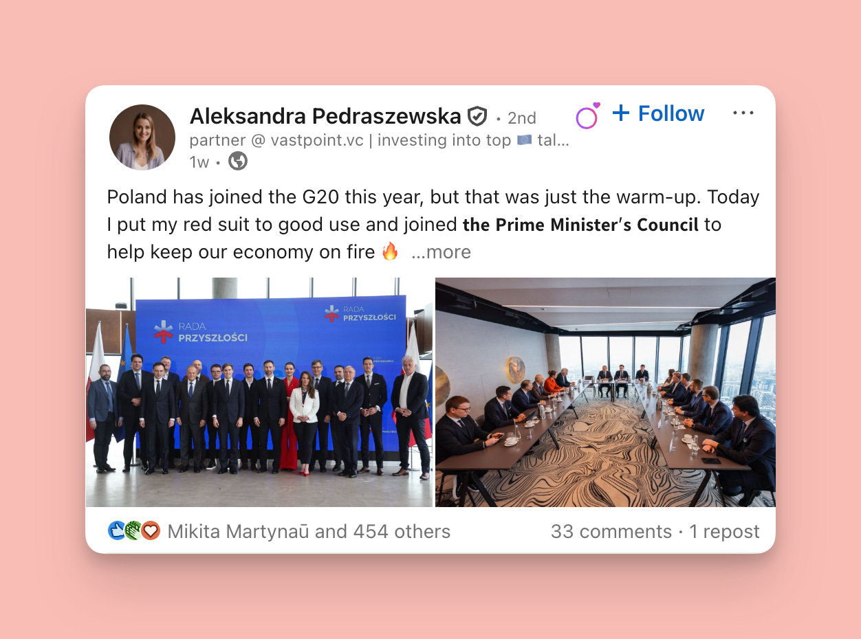 National pride hook: “Poland has joined the G20 this year, but that was just the warm-up” - ties personal news to bigger moment
