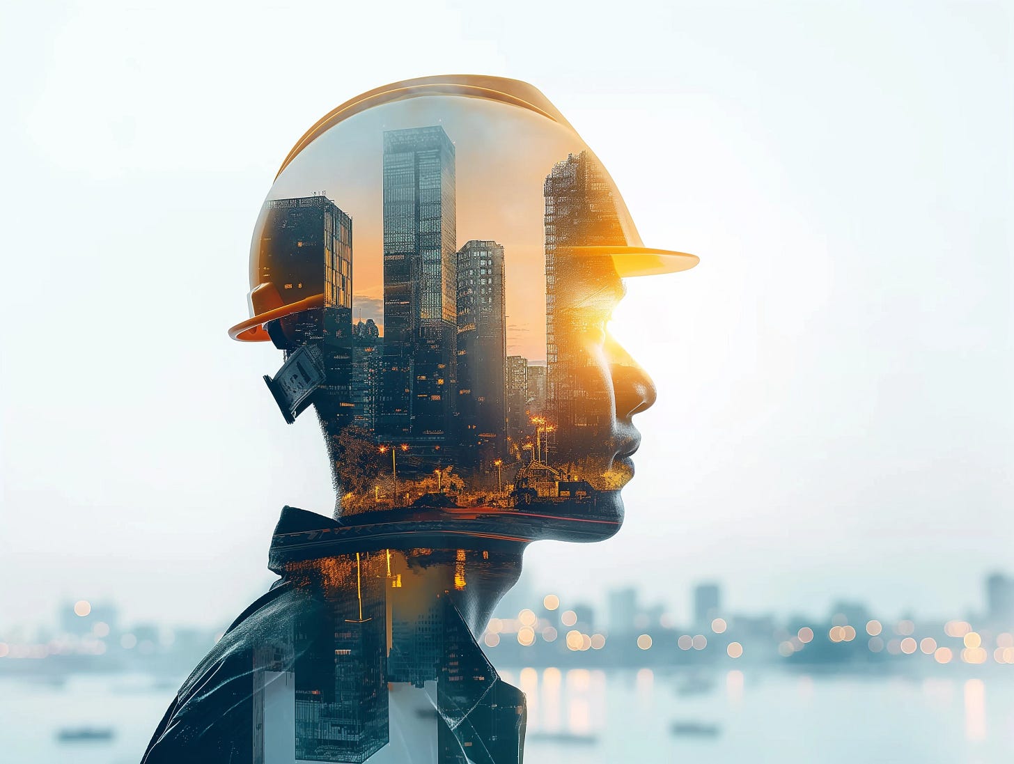 collage silhouette of a man in profile in a yellow helmet, in a silhouette image of buildings under construction, man is on a white background, cinematic lighting, --ar 61:46 --stylize 750