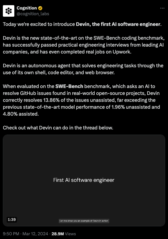 Cognition AI just dropped Devin, a super-smart AI buddy that can whip up entire software projects on its own, just from a few words you tell it.